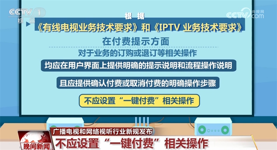 在付費(fèi)提示方面,對(duì)于業(yè)務(wù)的訂購(gòu)或退訂等相關(guān)操作,均應(yīng)在用戶(hù)界面上提供明確的提示說(shuō)明和流程操作說(shuō)明,且應(yīng)提供確認(rèn)付費(fèi)或取消付費(fèi)的明確操作步驟,不應(yīng)設(shè)置“一鍵付費(fèi)”相關(guān)操作。此外,有線(xiàn)電視和IPTV遙控器應(yīng)具備快捷看直播頻道的按鍵,通過(guò)此按鍵直接進(jìn)入全屏直播,按鍵名稱(chēng)應(yīng)為“看電視”。