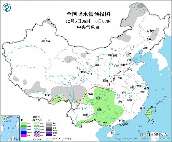 12月4日08時(shí)至5日08時(shí),新疆北部、甘肅河西、青海南部、西藏中東部和南部、川西高原北部等地部分地區(qū)有小到中雪或雨夾雪,其中,新疆阿勒泰山區(qū)和伊犁河谷、西藏南部等地部分地區(qū)有大到暴雪,局地大暴雪(20~22毫米)。湖南南部、江西南部、浙江大部、福建、廣東東部和北部、廣西西部、云南南部、海南島、臺(tái)灣島等地部分地區(qū)有小到中雨,其中,臺(tái)灣島中南部等地部分地區(qū)有大雨(25~40毫米)。新疆北疆北部、內(nèi)蒙古大部、甘肅河西等地部分地區(qū)有4~6級(jí)風(fēng)(見圖1)。