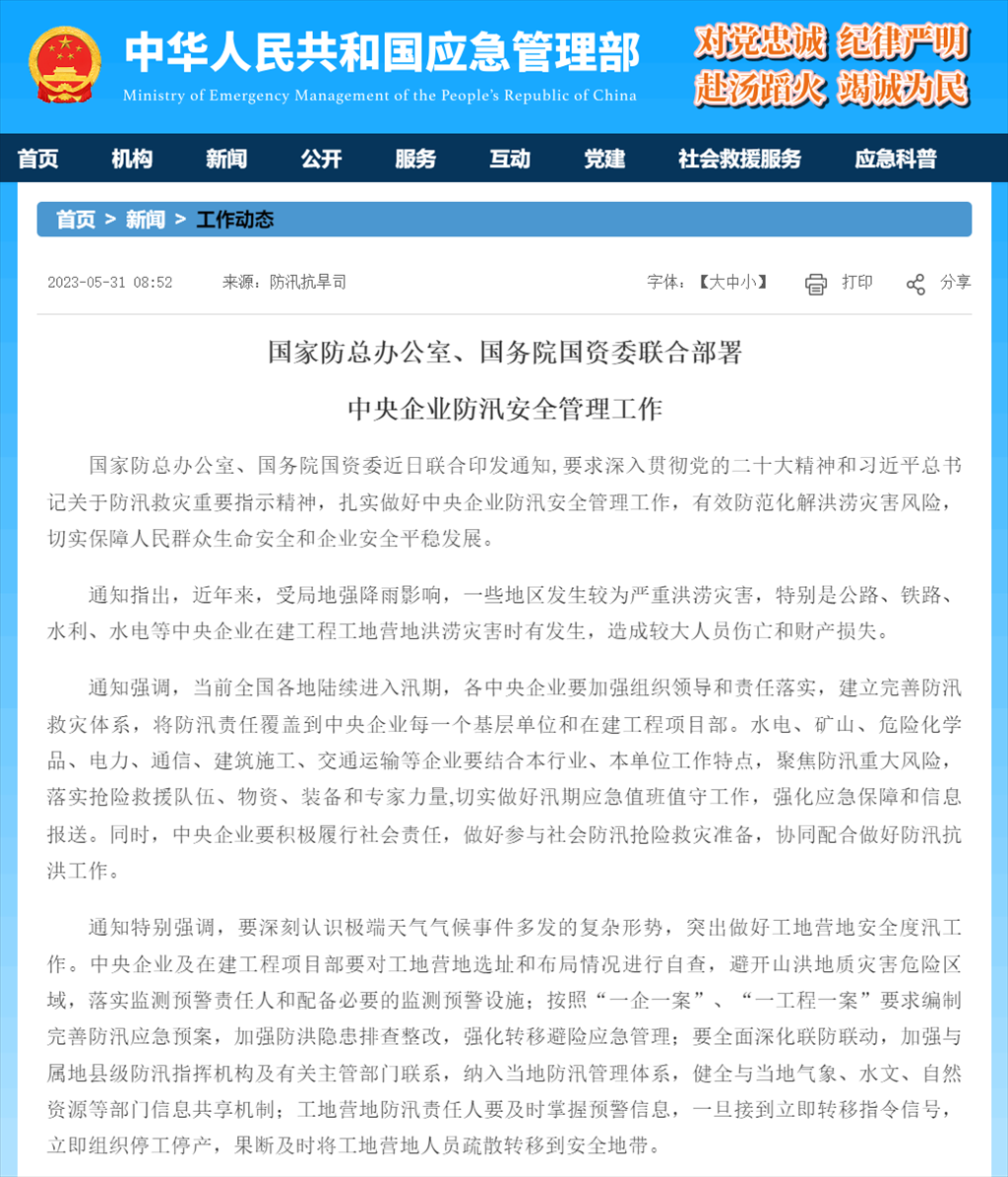 兩部門聯(lián)合部署中央企業(yè)防汛安全管理工作:要對工地營地選址和布局情況進(jìn)行自查 通知特別強(qiáng)調(diào),要深刻認(rèn)識極端天氣氣候事件多發(fā)的復(fù)雜......
