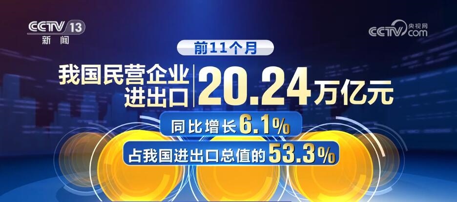 前11個(gè)月,我國(guó)民營(yíng)企業(yè)進(jìn)出口20.24萬億元,同比增長(zhǎng)6.1%,占我國(guó)進(jìn)出口總值的53.3%,提升3.1個(gè)百分點(diǎn)。同期,上海、江蘇、浙江、安徽等長(zhǎng)三角區(qū)域合計(jì)進(jìn)出口13.87萬億元,同比增長(zhǎng)0.6%,其中出口同比增長(zhǎng)1%,拉動(dòng)同期我國(guó)出口增長(zhǎng)0.4個(gè)百分點(diǎn),強(qiáng)勁活躍的增長(zhǎng)極功能不斷鞏固提升。???????