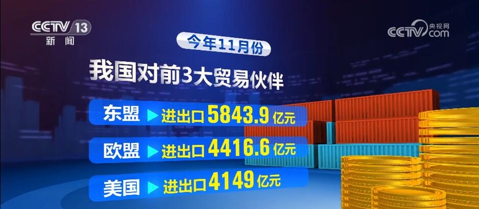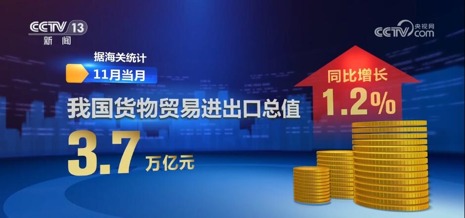 央視網(wǎng)消息:海關(guān)總署今天(12月7日)對(duì)外公布,今年11月份,我國(guó)貨物貿(mào)易進(jìn)出口總值3.7萬億元,同比增長(zhǎng)1.2%。數(shù)據(jù)顯示,我國(guó)外貿(mào)穩(wěn)中向好態(tài)勢(shì)進(jìn)一步鞏固。