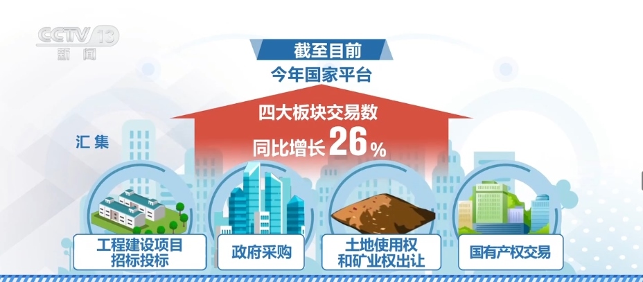 另外,全國公共資源交易平臺上的交易信息匯集發(fā)布量又創(chuàng)新高。截至目前,2023年國家平臺匯集工程建設項目招標投標、政府采購、土地使用權和礦業(yè)權出讓、國有產(chǎn)權交易這四大板塊交易數(shù)同比增長26%。