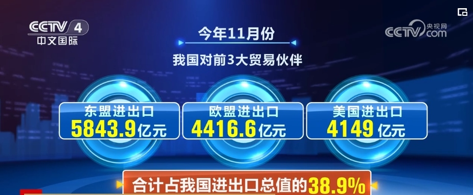 同時,對部分傳統(tǒng)市場貿(mào)易也出現(xiàn)積極變化。我國對前三大貿(mào)易伙伴東盟、歐盟、美國分別進(jìn)出口5843.9億元、4416.6億元、4149億元,合計(jì)占我國進(jìn)出口總值的38.9%。11月當(dāng)月,中美貨物貿(mào)易同比增長2.7%,結(jié)束連續(xù)6個月的同比下降,環(huán)比增長4.3%。