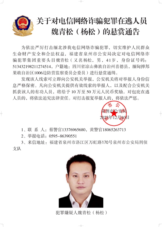 為依法嚴(yán)厲打擊緬北涉我電信網(wǎng)絡(luò)詐騙犯罪,切實(shí)維護(hù)人民群眾生命財(cái)產(chǎn)安全和合法權(quán)益,遼寧省大連市公安局決定對白所成、白應(yīng)蒼(又名李云晨)、白應(yīng)蘭(又名李夢娜)進(jìn)行公開懸賞通緝;福建省泉州市公安局決定對魏懷仁、魏榕(又名陳榕)、魏青松(又名楊松)進(jìn)行公開懸賞通緝;福建省龍巖市公安局決定對劉正祥、劉積光(又名李華光)、劉正茂進(jìn)行公開懸賞通緝;重慶市公安局決定對徐老發(fā)(又名徐發(fā)啟)進(jìn)行公開懸賞通緝。