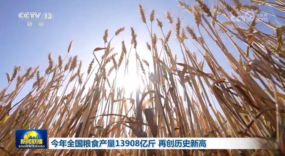 央視網消息(新聞聯(lián)播):國家統(tǒng)計局今天(12月11日)發(fā)布全年糧食產量數據,2023年全國糧食總產量達13908.2億斤,再創(chuàng)歷史新高,連續(xù)9年穩(wěn)定在1.3萬億斤以上。