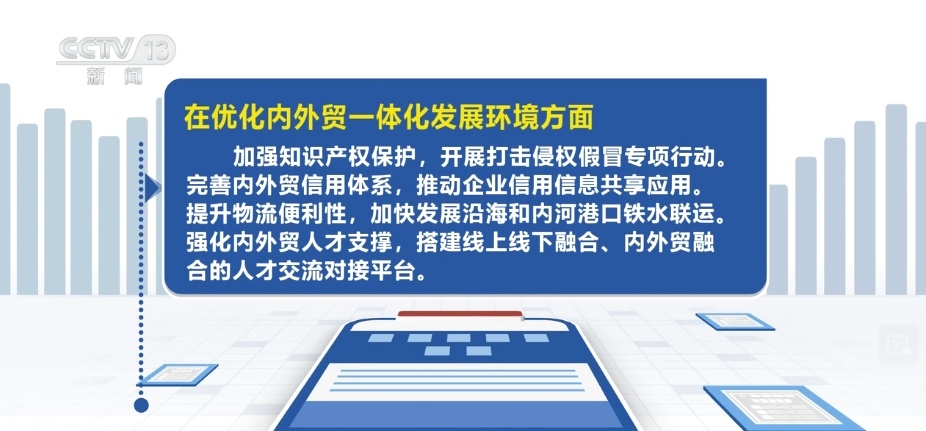 在優(yōu)化內(nèi)外貿(mào)一體化發(fā)展環(huán)境方面,加強(qiáng)知識產(chǎn)權(quán)保護(hù),開展打擊侵權(quán)假冒專項(xiàng)行動。完善內(nèi)外貿(mào)信用體系,推動企業(yè)信用信息共享應(yīng)用。提升物流便利性,加快發(fā)展沿海和內(nèi)河港口鐵水聯(lián)運(yùn)。強(qiáng)化內(nèi)外貿(mào)人才支撐,搭建線上線下融合、內(nèi)外貿(mào)融合的人才交流對接平臺。