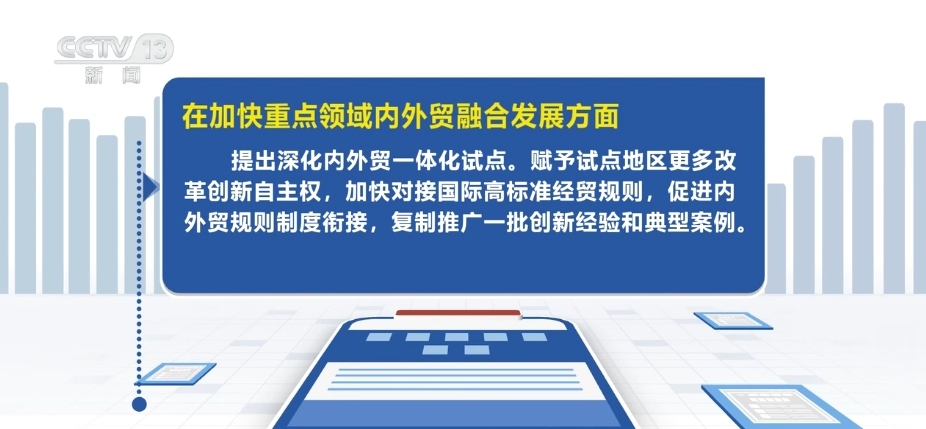 在加快重點(diǎn)領(lǐng)域內(nèi)外貿(mào)融合發(fā)展方面,提出深化內(nèi)外貿(mào)一體化試點(diǎn)。賦予試點(diǎn)地區(qū)更多改革創(chuàng)新自主權(quán),加快對接國際高標(biāo)準(zhǔn)經(jīng)貿(mào)規(guī)則,促進(jìn)內(nèi)外貿(mào)規(guī)則制度銜接,復(fù)制推廣一批創(chuàng)新經(jīng)驗(yàn)和典型案例。