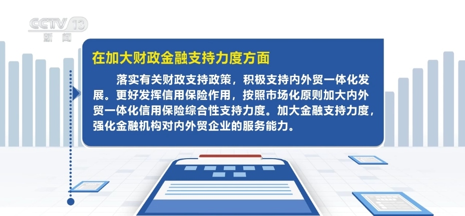 在加大財(cái)政金融支持力度方面,落實(shí)有關(guān)財(cái)政支持政策,積極支持內(nèi)外貿(mào)一體化發(fā)展。更好發(fā)揮信用保險(xiǎn)作用,按照市場化原則加大內(nèi)外貿(mào)一體化信用保險(xiǎn)綜合性支持力度。加大金融支持力度,強(qiáng)化金融機(jī)構(gòu)對內(nèi)外貿(mào)企業(yè)的服務(wù)能力。