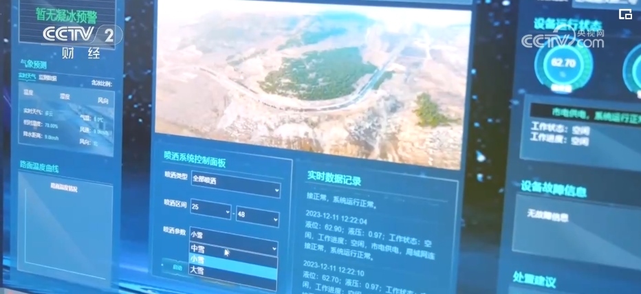 12月11日上午,記者看到肥城市交通部門工作人員,在監(jiān)控中心,遠(yuǎn)程啟動(dòng)了路面融冰融雪系統(tǒng)。在儀汶公路棋石嶺“S”形路段出,路邊噴頭噴灑環(huán)保型融雪劑快速融化路面的冰雪。