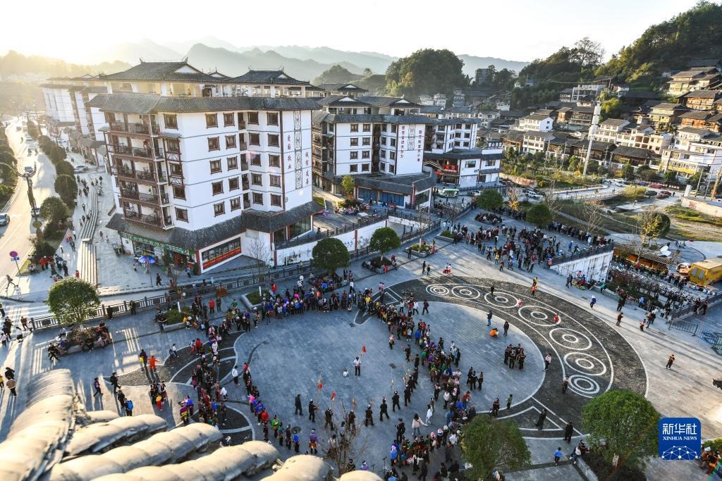 在貴州省雷山縣龍頭街道一處易地扶貧搬遷安置點(diǎn),村民和游客在苗年活動(dòng)中跳蘆笙舞(2020年11月19日攝)。新華社記者 楊文斌 攝
