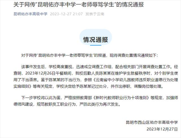 ·昆明某中學老師辱罵學生?校方通報:給予記過、停職、調整崗位等處理。