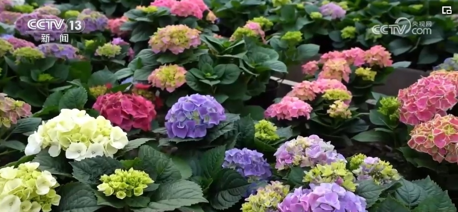 云南楚雄州姚安縣是云南鮮花主產(chǎn)區(qū)之一。眼下,以繡球花為代表的年宵花開得正艷。