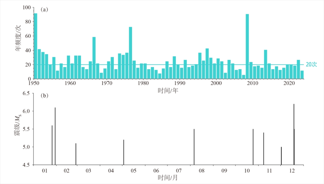 2023年以來大陸東部及附近海域發(fā)生5級以上地震3次,分別為6月24日北部灣5.0級、8月6日山東平原5.5級和10月23日廣東南澳縣海域5.0級地震,地震活動水平較2022年(0次)顯著增強(qiáng),為 2014 年以來活動頻次最高年份。