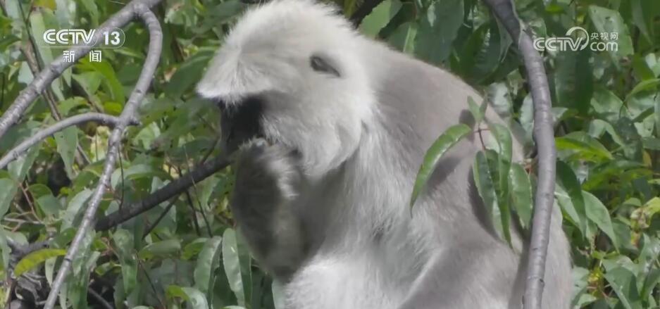 突然,林間騷動(dòng)起來,幾只長(zhǎng)尾葉猴從天而降來到塔爾羊中間,這是首次記錄到這兩個(gè)物種群體同框覓食的珍貴畫面。對(duì)它們而言,聚在一起可以加強(qiáng)警戒,更容易發(fā)現(xiàn)天敵。