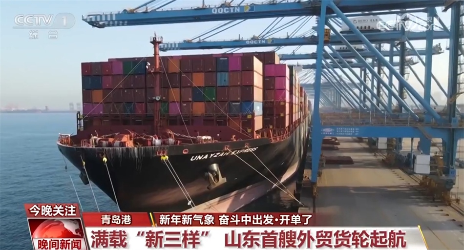 新年伊始,山東首艘外貿(mào)貨輪從青島港起航。3500多個(gè)標(biāo)箱里滿載包括電動(dòng)載人汽車(chē)、鋰離子蓄電池、太陽(yáng)能電池等外貿(mào)“新三樣”,總貨值約2億人民幣。