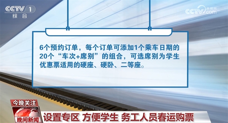 此外,符合條件的學(xué)生旅客(已通過(guò)學(xué)生優(yōu)惠資質(zhì)核驗(yàn)且有剩余優(yōu)惠乘車次數(shù))可通過(guò)“學(xué)生寒假訂票專項(xiàng)服務(wù)”專區(qū)預(yù)約購(gòu)買春運(yùn)期間(1月26日至3月5日)火車票,每名旅客最多可同時(shí)提交6個(gè)預(yù)約訂單,每個(gè)訂單可添加1個(gè)乘車日期的20個(gè)“車次+席別”的組合,可選席別為學(xué)生優(yōu)惠票適用的硬座、硬臥、二等座。
