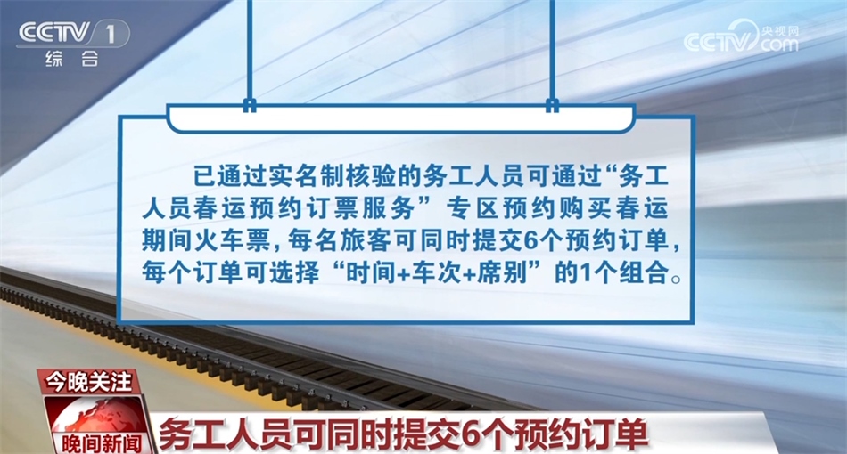 已通過(guò)實(shí)名制核驗(yàn)的務(wù)工人員可通過(guò)“務(wù)工人員春運(yùn)預(yù)約訂票服務(wù)”專區(qū)預(yù)約購(gòu)買春運(yùn)期間火車票,每名旅客可同時(shí)提交6個(gè)預(yù)約訂單,每個(gè)訂單可選擇“時(shí)間+車次+席別”的1個(gè)組合。