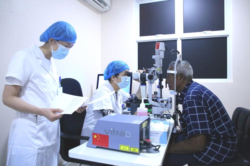 69歲的艾哈邁德·卡洛是中國醫(yī)療隊(duì)“光明行”活動的獲益者。兩個兒子曾帶著患有眼疾多年的老人輾轉(zhuǎn)多家醫(yī)院,均因手術(shù)難度大而無法得到有效治療。2023年,中國醫(yī)療隊(duì)醫(yī)生經(jīng)過充分評估后,給老人成功實(shí)施了手術(shù)。術(shù)后揭開眼罩時,老人家激動地說:“醫(yī)生,我可以看到你的胸牌了,謝謝你!”老人的兒子也在社交媒體發(fā)帖說:“真誠感謝中國醫(yī)生。”除了治病,中方還著力培訓(xùn)當(dāng)?shù)蒯t(yī)務(wù)人員,力爭為當(dāng)?shù)卮蛟煲恢А皫Р蛔摺钡难劭茖<谊?duì)伍。