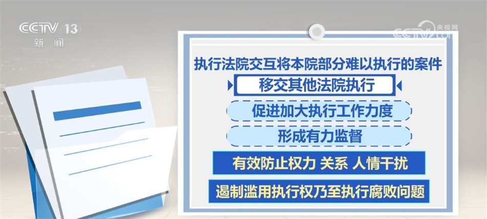 2023年10月,最高人民法院部署開展交叉執(zhí)行工作試點。據介紹,交叉執(zhí)行是指通過指定、提級執(zhí)行,執(zhí)行法院交互將本院部分難以執(zhí)行的案件移交其他法院執(zhí)行,促進加大執(zhí)行工作力度,并形成有力監(jiān)督,有效防止權力、關系、人情干擾,遏制濫用執(zhí)行權乃至執(zhí)行腐敗問題。