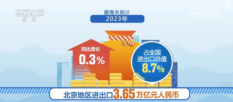 據(jù)海關(guān)統(tǒng)計(jì),2023年,北京地區(qū)進(jìn)出口3.65萬億元人民幣,同比增長0.3%,占全國進(jìn)出口總值的8.7%。