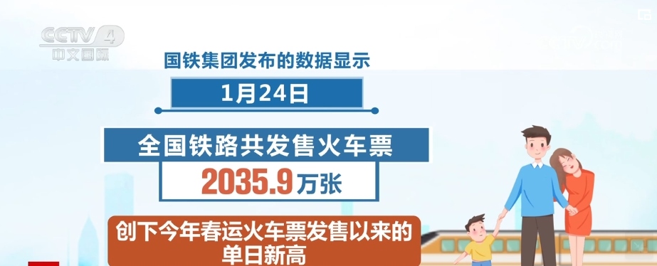 國(guó)鐵集團(tuán)發(fā)布的數(shù)據(jù)顯示,1月24日,全國(guó)鐵路共發(fā)售火車票2035.9萬(wàn)張,創(chuàng)下2024年春運(yùn)火車票發(fā)售以來(lái)的單日新高,這標(biāo)志著節(jié)前售票高峰已經(jīng)到來(lái)。