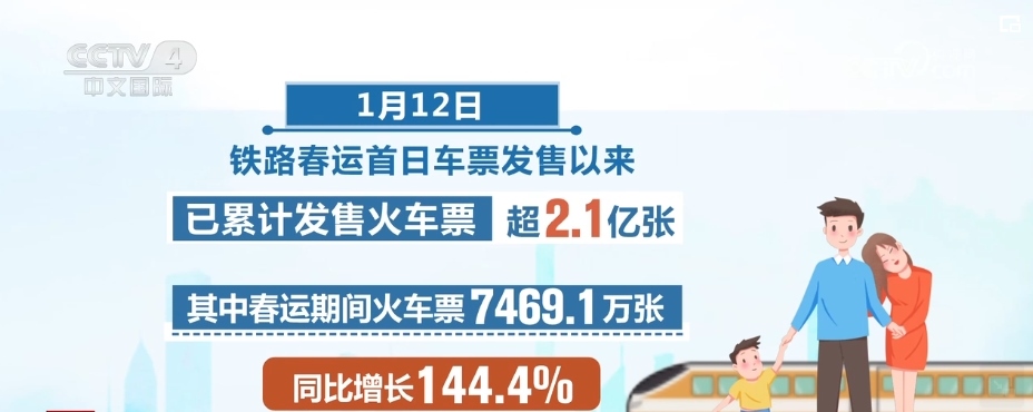 自1月12日鐵路春運(yùn)首日車票發(fā)售以來(lái),已累計(jì)發(fā)售火車票超2.1億張。其中,春運(yùn)期間火車票7469.1萬(wàn)張,同比增長(zhǎng)144.4%。為滿足旅客旺盛的出行需求,全國(guó)鐵路統(tǒng)籌新線與既有線路、高鐵與普速鐵路,啟用春運(yùn)列車運(yùn)行圖,加大客運(yùn)能力投放。