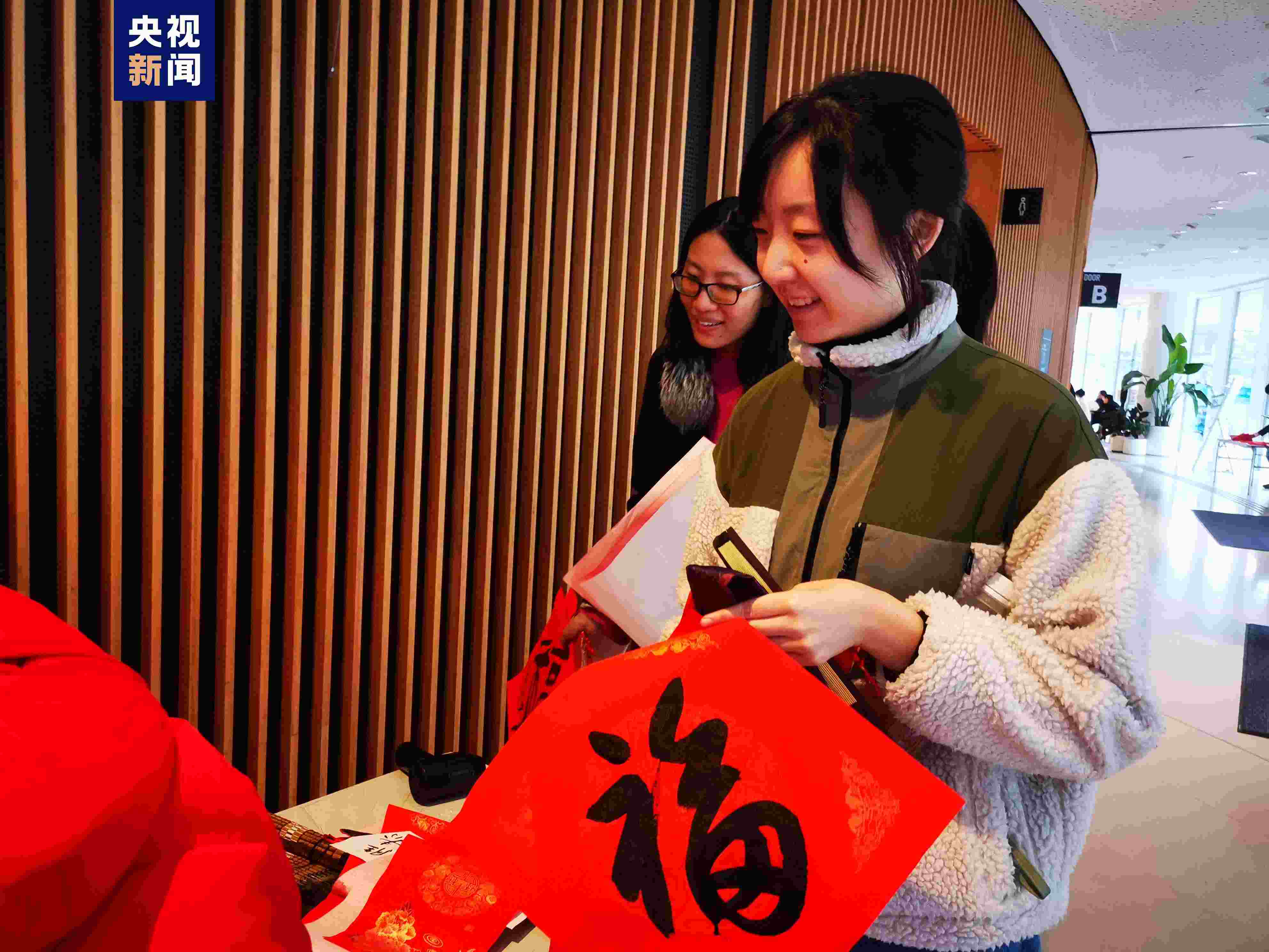 除了佩戴小龍帽,大家或手拿龍玩偶,或高舉福字,或展示對聯(lián),在歡聲笑語中共同迎春。