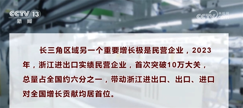 長三角區(qū)域另一個(gè)重要增長極是民營企業(yè),2023年,浙江進(jìn)出口實(shí)績民營企業(yè)首次突破10萬大關(guān),總量占全國約六分之一,帶動(dòng)浙江進(jìn)出口、出口、進(jìn)口對(duì)全國增長貢獻(xiàn)均居首位。