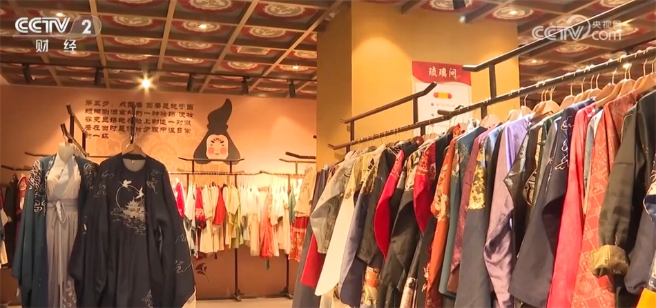 總臺記者 秦祎:我旁邊的這件就是店內(nèi)最受歡迎的唐裝之一——花想容,這件衣服里面是一件唐裝的基礎(chǔ)款造型齊胸襦裙,披上外披則是貴妃造型,如果擔心天氣冷可以像我一樣加上斗篷。