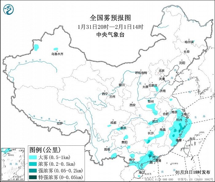 此外,1月31日夜間至2月1日上午,河南中南部、湖北東南部、湖南南部、江西中部、江蘇南部、浙江大部、福建中北部、廣東西南部、廣西東南部等地的部分地區(qū)有大霧天氣,其中,浙江南部、福建北部、廣東中部等地的部分地區(qū)有能見度不足500米的濃霧,局地能見度不足200米。