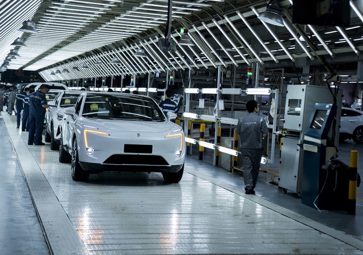 在重慶市長安汽車生產基地車間內,新能源汽車阿維塔生產下線。新華社記者李前磊 攝