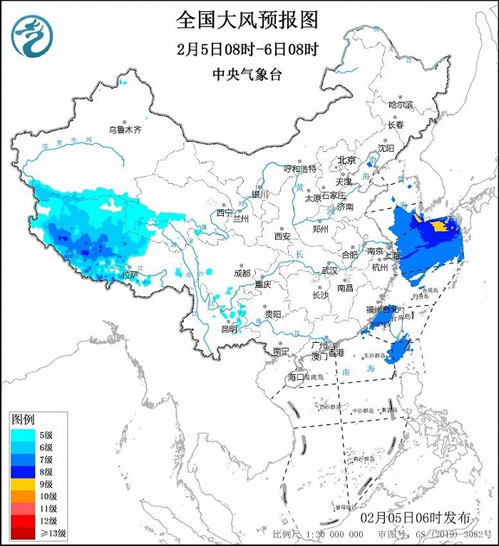 預計,2月5日08時至6日08時,西藏中西部、青海西南部等地將有5~7級、陣風8級的大風;黃海南部海域、東海大部海域、臺灣海峽、巴士海峽將有7~8級、陣風9級的大風,其中黃海東南部、東海東北部的部分海域風力可達9級、陣風10級。