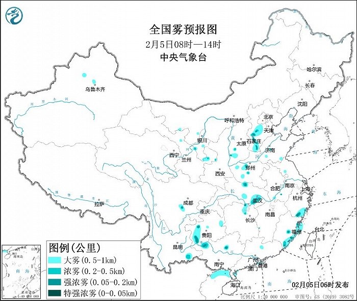 預計,5日早晨至上午,雷州半島沿岸海域、粵西沿岸海域、北部灣偏北海域、福建沿岸的部分海域將有大霧,能見度不足1公里。此外,河北西部、山西西南部、河南南部、湖北中東部、浙江東南部、福建東部、貴州西部等地有大霧天氣,局地有能見度不足200米的強濃霧。