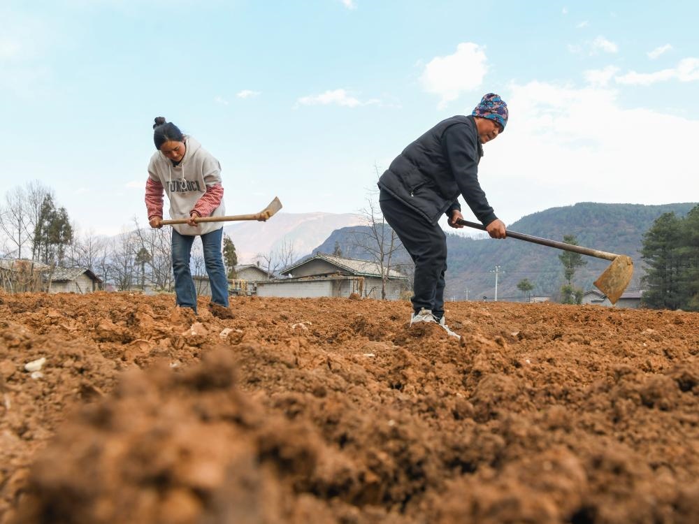 2月2日,巴木玉布木(左)和丈夫巫其石且在翻耕承包的土地,準(zhǔn)備來(lái)年種植葡萄。新華社記者 王曦 攝