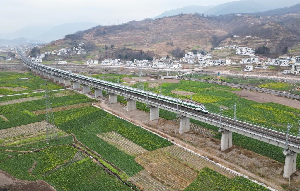 這是2月3日,一趟列車(chē)通過(guò)越西縣城郊(無(wú)人機(jī)照片)。新華社記者 王曦 攝