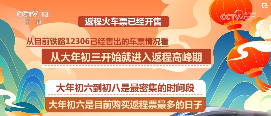 春節(jié)的返程火車票已經(jīng)開售,從目前鐵路12306已經(jīng)售出的車票情況看,從大年初三開始就進(jìn)入大家返程的高峰期,大年初六到初八是最密集的時(shí)間段,其中,大年初六是目前購買返程票最多的日子。