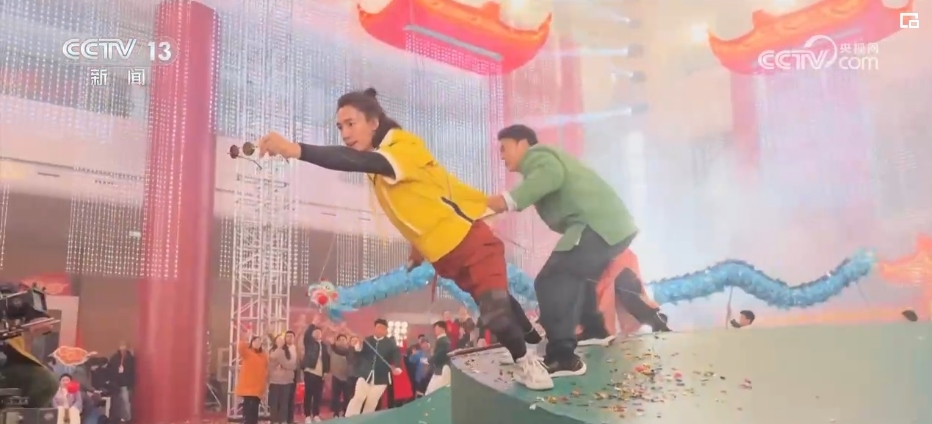 央視網(wǎng)消息:中央廣播電視總臺《2024年春節(jié)聯(lián)歡晚會(huì)》武術(shù)節(jié)目《爭春》由袁和平作為監(jiān)制,樊少皇、吳樾、此沙三位演員與塔溝武校的學(xué)員們,分為三支舞龍隊(duì)比拼武藝、以武爭春。節(jié)目中再現(xiàn)經(jīng)典武術(shù)招式,同時(shí)融入了更多生活化的情節(jié),一招一式剛?cè)岵?jì),盡顯春日里萬物競發(fā)勃勃生機(jī)。