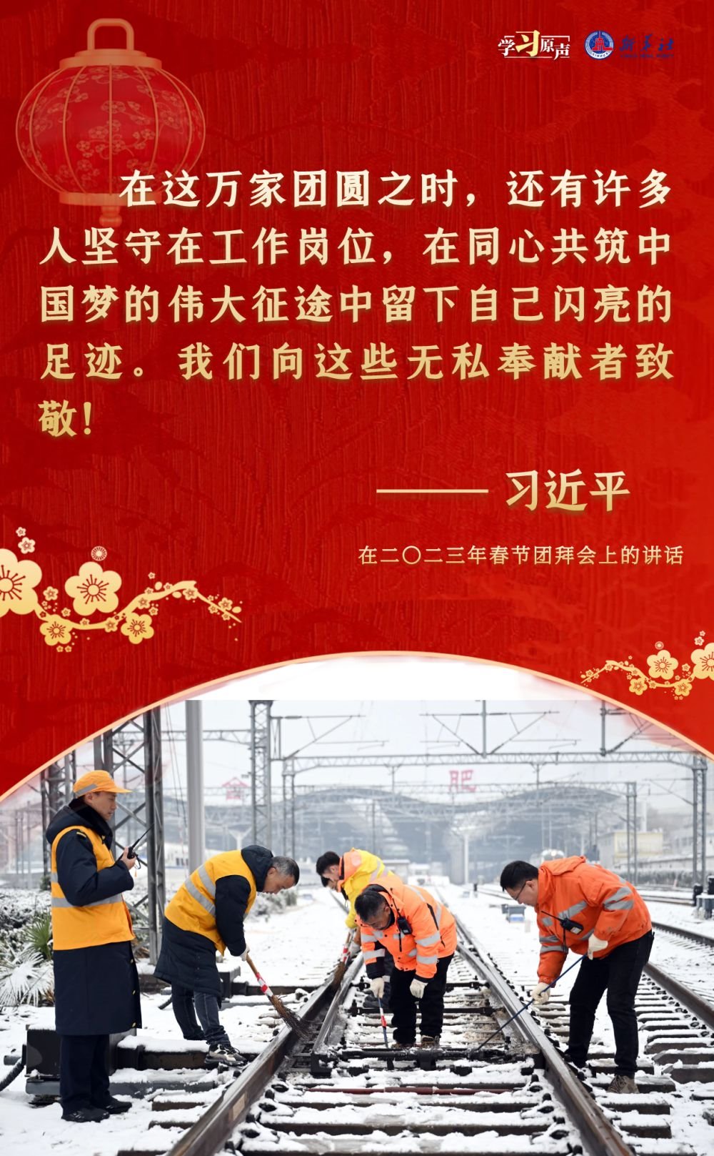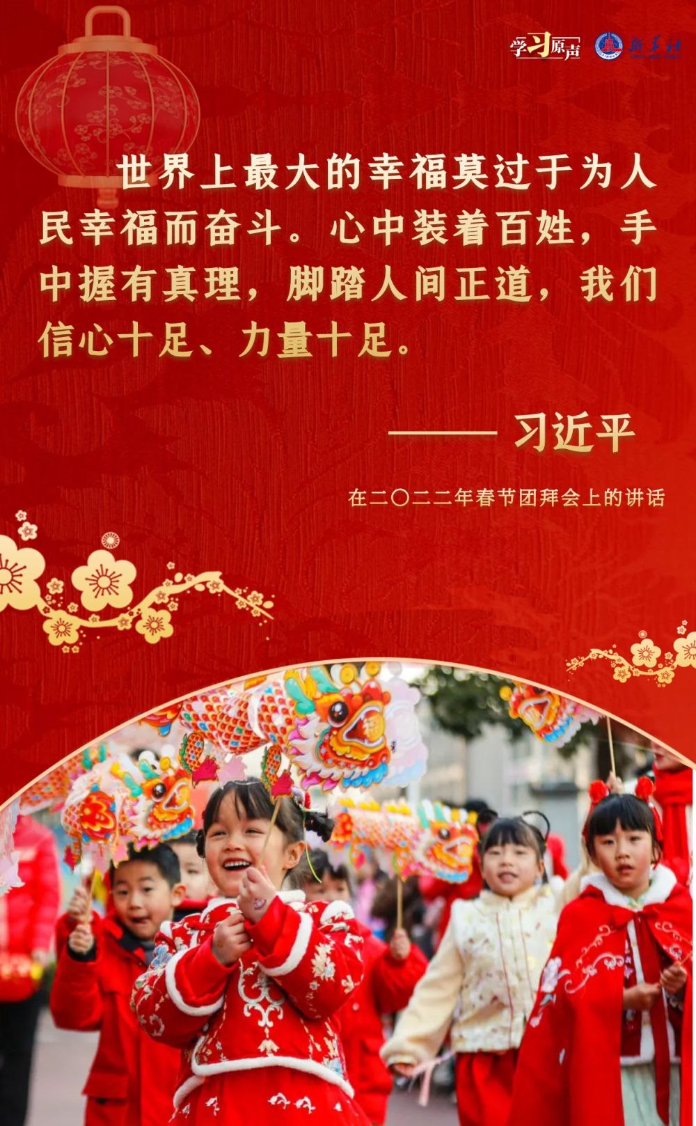 農(nóng)歷新年前夕,習(xí)近平總書記在春節(jié)團(tuán)拜會(huì)上發(fā)表熱情洋溢的講話,辭舊歲、賀新春,送祝福、道真情??倳洔嘏辛Φ脑捳Z鼓舞人心,催人奮進(jìn),凝聚奮進(jìn)新征程的磅礴力量。