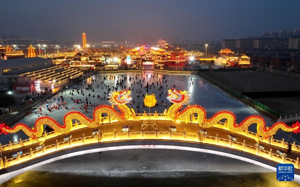 游客在河北省唐山市豐南區(qū)河頭老街滑冰場(chǎng)滑冰(無(wú)人機(jī)照片)。