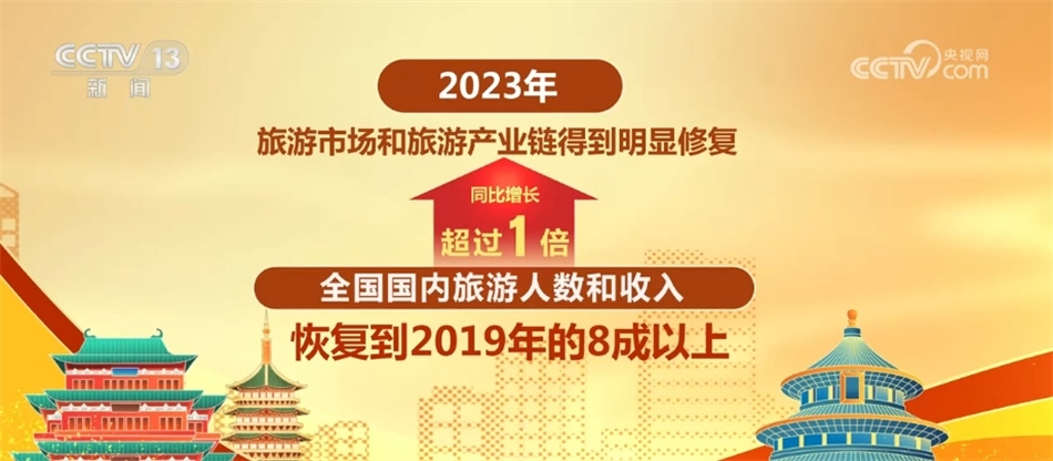 2023年,旅游市場和旅游產(chǎn)業(yè)鏈得到明顯修復(fù),全國國內(nèi)旅游人數(shù)和收入同比增長超過1倍,恢復(fù)到2019年的8成以上;入出境旅游人數(shù)超過1.9億人次,較上一年增長2.8倍以上。