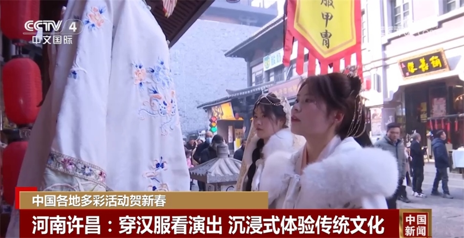在河南許昌曹魏古城景區(qū),各種傳統(tǒng)游園項目讓人應接不暇,不少游客穿上漢服,戴上鮮艷的簪花,穿梭于亭臺樓榭之間,與古城相映成趣。