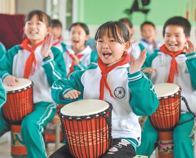 江西省樟樹(shù)市義成鎮(zhèn)中心小學(xué)學(xué)生在練習(xí)樂(lè)器演奏。目前,我國(guó)基礎(chǔ)教育普及水平總體達(dá)到世界中上行列。周 亮攝(影像中國(guó))