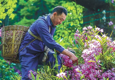四川省瀘州市合江縣福寶鎮(zhèn)種植基地,村民在采摘金釵石斛鮮花。各地發(fā)展綠色生態(tài)農(nóng)業(yè),積極打造特色農(nóng)產(chǎn)品優(yōu)勢(shì)品牌,助推鄉(xiāng)村全面振興。李貴平攝(影像中國(guó))