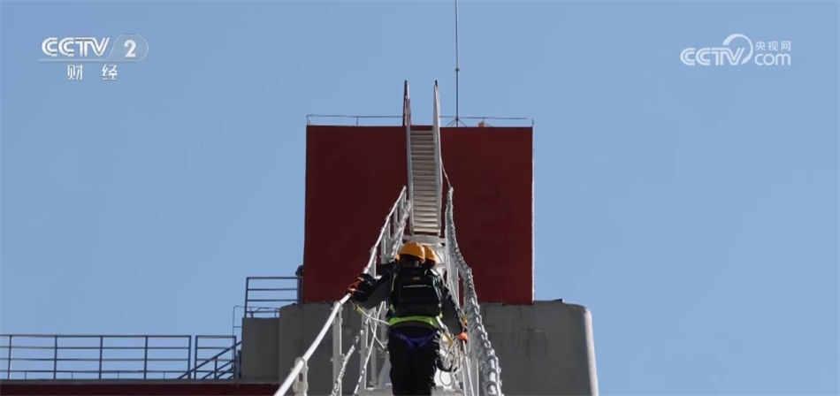 經(jīng)過30分鐘左右的攀爬,他們到達(dá)了整座大橋最高的位置,開始檢查鞍罩。鞍罩就是像馬鞍一樣的罩子,主要是為了保護(hù)邊跨和主跨的連接部位,鞍罩內(nèi)還裝有大橋健康檢測系統(tǒng)和除濕系統(tǒng),實(shí)時監(jiān)控大橋的健康狀態(tài)。