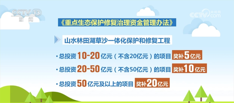 資金具體怎么分配?新辦法指出,山水林田湖草沙一體化保護(hù)和修復(fù)工程總投資10億元—20億元(不含20億元)的項(xiàng)目獎(jiǎng)補(bǔ)5億元;工程總投資20億元—50億元(不含50億元)的項(xiàng)目獎(jiǎng)補(bǔ)10億元;工程總投資50億元及以上的項(xiàng)目獎(jiǎng)補(bǔ)20億元。歷史遺留廢棄工礦土地整治總投資5億元及以上的項(xiàng)目獎(jiǎng)補(bǔ)3億元。