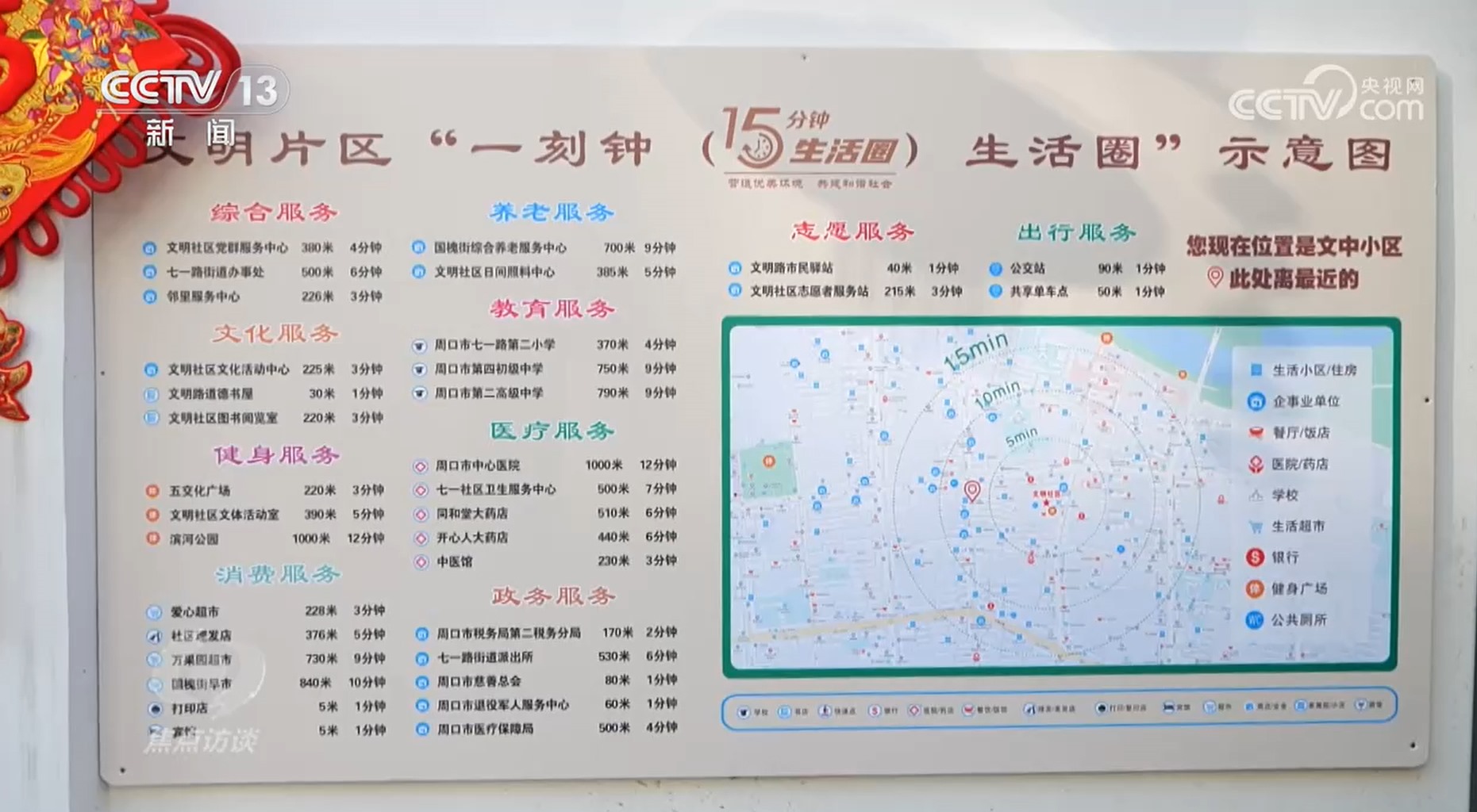 央視網(wǎng)消息(焦點(diǎn)訪談):走出家門,在步行一刻鐘的范圍內(nèi)可以做些什么?河南周口市川匯區(qū)文明片區(qū)的15分鐘生活圈地圖上可以看到百姓基本生活所需幾乎全部覆蓋。河南省周口市是農(nóng)業(yè)大市、人口大市,長期以來,這里城市化水平比較低,城市基礎(chǔ)設(shè)施和公共服務(wù)設(shè)施建設(shè)歷史欠賬多。川匯區(qū)作為城市的老舊小區(qū),遺留問題尤其多。2023年,川匯區(qū)在改造老舊小區(qū)的同時,著力打造15分鐘便民生活圈。經(jīng)過一系列的措施,現(xiàn)在居民的生活怎樣了呢?
