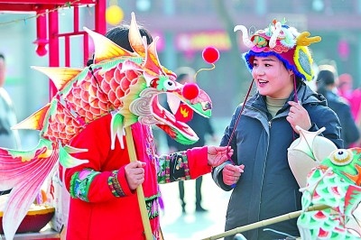 山東省臨沂市郯國古城春節(jié)大廟會(huì)上,小孩拿著玩具龍看表演。新華社發(fā)