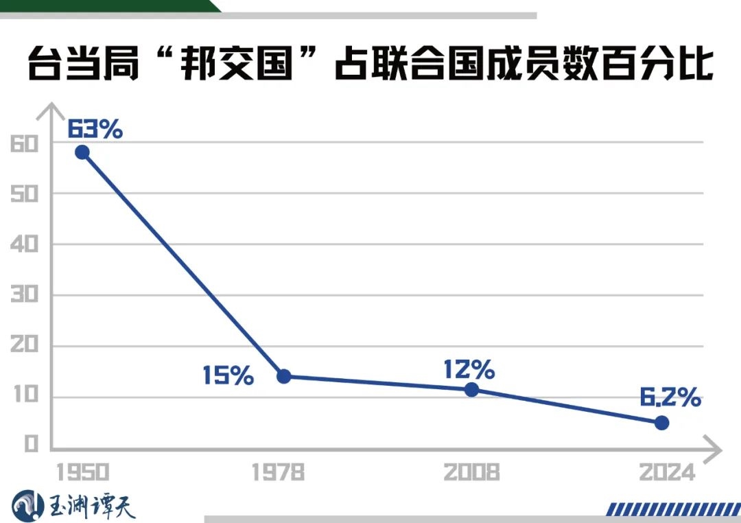 可以看到,1950年,臺灣當(dāng)局“邦交國”數(shù)量占聯(lián)合國成員國數(shù)量的比例,還高達63%。