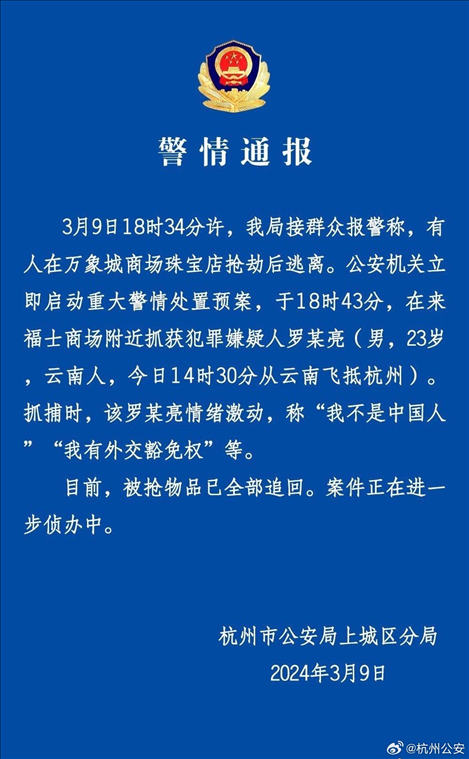 ·杭州市公安局上城分局通報(bào)杭州一商場(chǎng)男子搶劫金店。