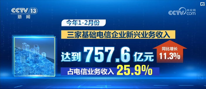 數(shù)據(jù)顯示,2024年1—2月份,三家基礎(chǔ)電信企業(yè)新興業(yè)務(wù)收入達(dá)到757.6億元,同比增長(zhǎng)11.3%,占電信業(yè)務(wù)收入的25.9%,其中,云計(jì)算和大數(shù)據(jù)收入分別同比增長(zhǎng)17.3%和30.3%。截至2月末,三家基礎(chǔ)電信企業(yè)發(fā)展蜂窩物聯(lián)網(wǎng)終端用戶(hù)23.64億戶(hù),占移動(dòng)網(wǎng)終端連接數(shù)比重達(dá)57.5%。